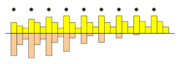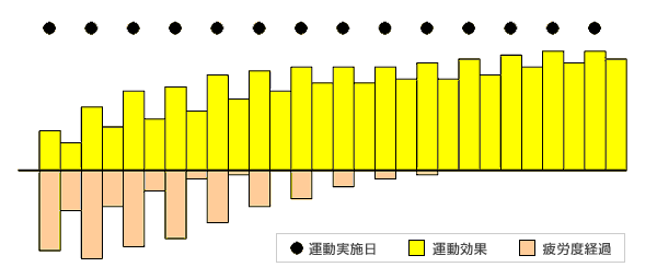お客様からもよく『効果を期待するには、週にどのくらい運動すればよいですか?』と相談されます。もちろんその方の生活習慣、体力レベル、運動内容によって異なりますが、一般的に言われていることは1日おきの実施です。運動強度(中等度~比較的強い)の場合は、図の通り効果と疲労の相関からも顕著に表れています。