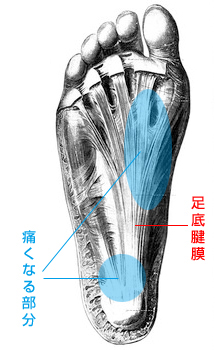 腱の付着部分である踵に痛みが生じたり、土踏まずの真ん中に痛みが生じるのはこのためです。一般的に足底筋膜炎・足底腱膜炎などといわれています。