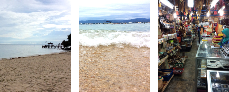 とは言うもののやはり今回の目的であるダイビングをしたかったのですが、天気予報では明日も明後日も明々後日も全て雨マークさらに雷マーク。この時期コタキナバルは乾期で最も雨量が少ない時期です。それなのに、まさかの4日目の朝も雨。ひょっとして、雨男になったのか・・・コタキナバルには今日と明日の1日、そして明後日は夕方クアラルンプール異動の予定。『どうしよう』さすがに3日間も街中の散歩は悲しすぎます。ホテルのツアーデスクに行って雨でも大丈夫そうなツアーに参加する方向でなくなく決心しました。その午後、雨が上がり明るくなったので、道端にいる怪しいツアーガイドのお兄ちゃんに小さいボートを出してもらい、近隣の島にシュノーケリングをしに行きました。曇っていたので透明度はあまりよくはありませんでしたが、島のビーチはサンゴ礁が広がり浅瀬でも十分すぎる熱帯魚は観ることができました。