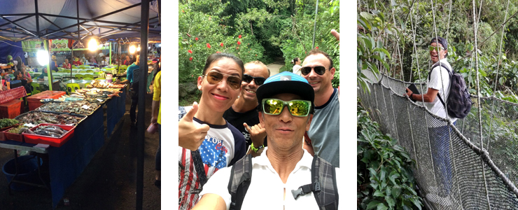 さて、5日目の朝、目が覚めると天気予報は外れて快晴。『えーっ!』でもこの日申し込んだツアーはキナバル山ジャングルウォーク。『なんで晴れるのかなぁ、こんなんだったらダイビング申し込めばよかった』と思いながらもツアーに出かける前に名物のサンデーマーケットに繰り出しました。このマーケットは日曜日の朝6時位から午前中開かれる市場で、色々なものが売られ、食材、日用品、ペットまで売っています。7時にはホテルに戻り、いよいよツアーに出発。迎えに来たバスにはフランス人、韓国人、フィリピン人、台湾人、オーストラリア人、日本人など様々な国の人がいて国際色豊かでかなり楽しそうなツアーです。ツアー内容は世界遺産のキナバル山のウォーキングと植物園の見学、ここではウツボカヅラやラフレシアなどの日本には生息しない食虫植物を観ることができます。さらにキャノピーウォークと言うつり橋を渡る体験ができます。日本では観たことのない植物や景色を満喫できました。