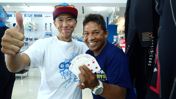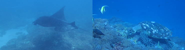 さて、旅行は後半戦、バリに戻ってダイビングが待っています。ここ何年も潜っていないし、足もまだ完全ではないので不安が残ります。 ダイビング当日、私の他に70前のおじさん?とオーストラリア人の男女が一緒でした。ガイドさんは日本語をしゃべる人で夜はマジシャンをしているそうです。カードを使ったマジックを披露してくれたり中々楽しい人でした。久しぶりのダイビングはウミガメ、マンタなども観ることができ足への負担もあまり気にせずできたので本当に良かったです。感動感動!